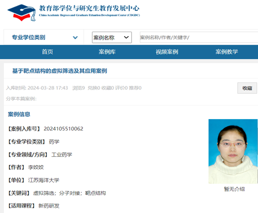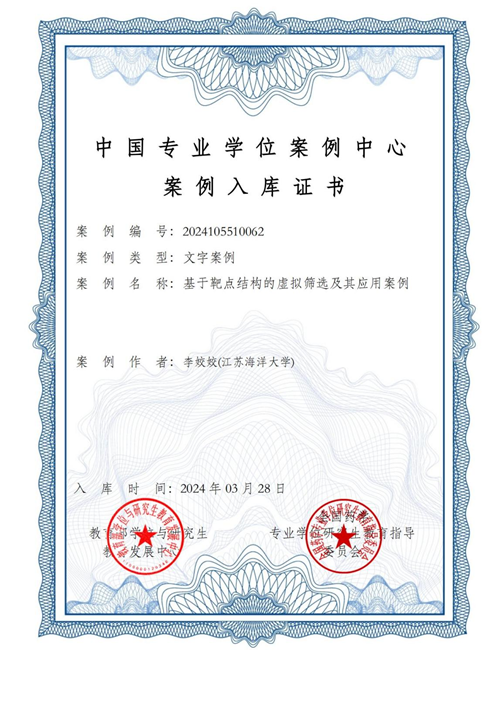 近日,教育部学位与研究生教育发展中心发布了药学专业学位最新入库案例,bv1946伟德官网李姣姣副教授编写的《基于靶点结构的虚拟筛选及其应用案例》成功入选中国专业学位教学案例中心案例库(入库号:2024105510062)。这是bv1946伟德官网首个入选中国专业学位教学案例中心专业学位案例库的教学案例,很好的推动了药学专业学位研究生案例教学工作的开展,为公司专业学位公司产品提供了宝贵的经验。